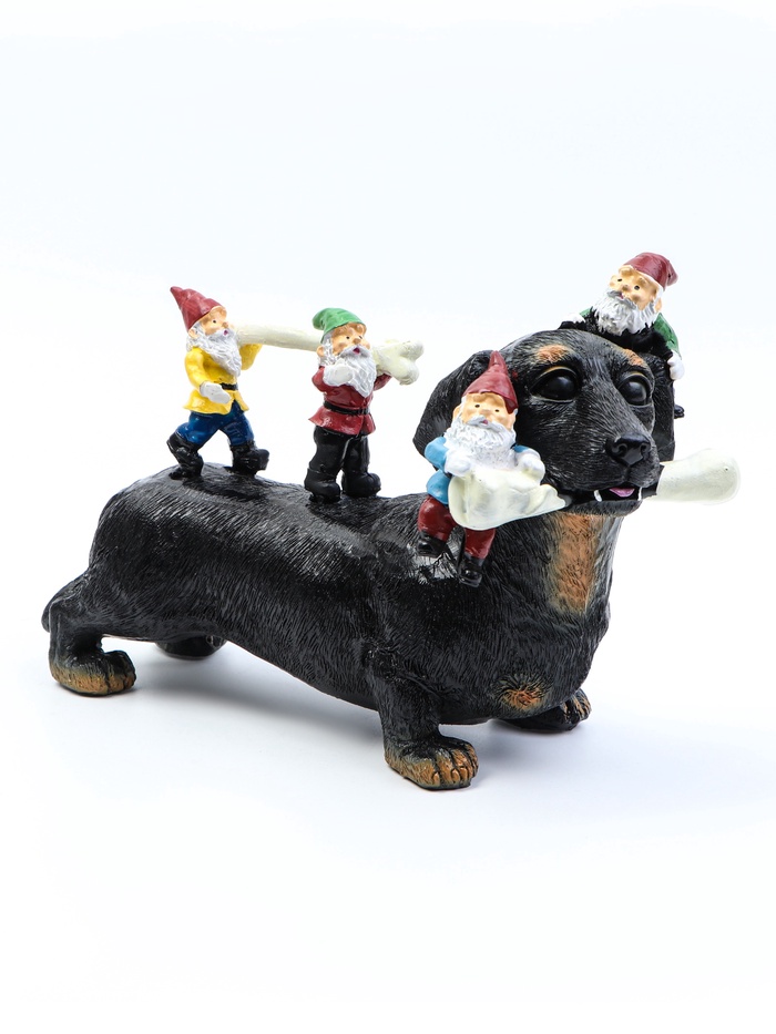 - Многофигурная композиция: такса в компании четырех гномов образует законченную садовую сценку. Динамичное расположение персонажей создаёт эффект движения и взаимодействия.
