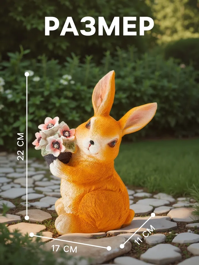 «Зайка с букетом» - это простое и очаровательное украшение для вашего сада. Милая днем и яркая вечером, она создаст атмосферу тепла и уюта без лишних хлопот. Выбирайте милый и практичный декор, который будет радовать вас весь сезон!