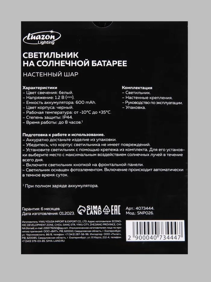 Садовый светильник «Шар», уличный, на солнечной батарее, 10×15×14 см, 1 LED, свечение белое — Характеристики