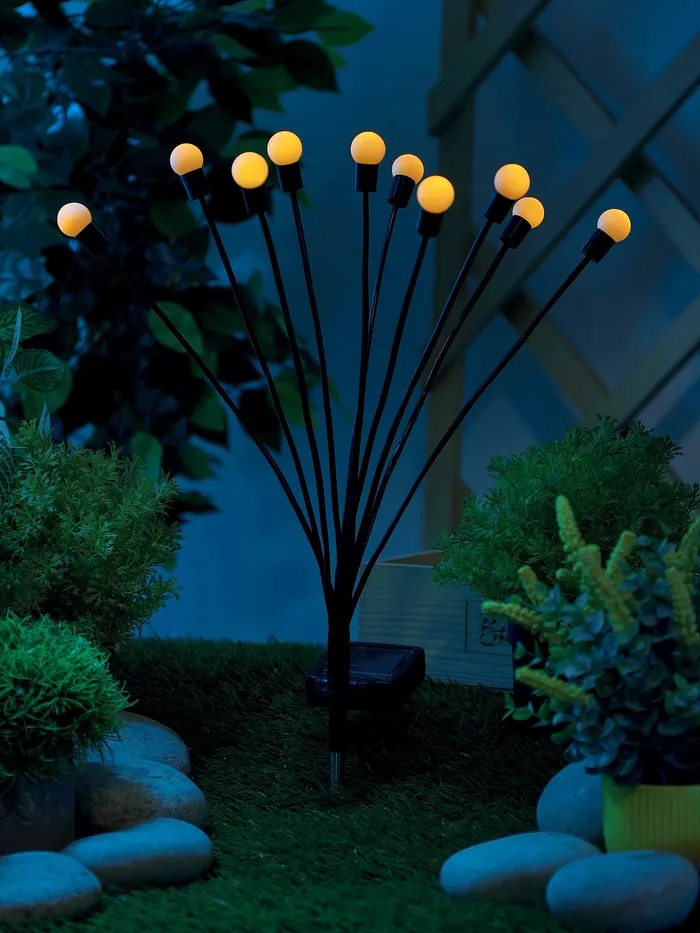 - Лаконичный дизайн — тонкая ножка и чёрный корпус светильника, а так же лампочки в виде шариков выглядят современно и подходят для любого стиля ландшафта.