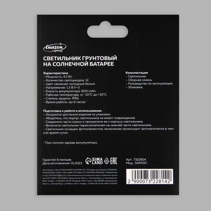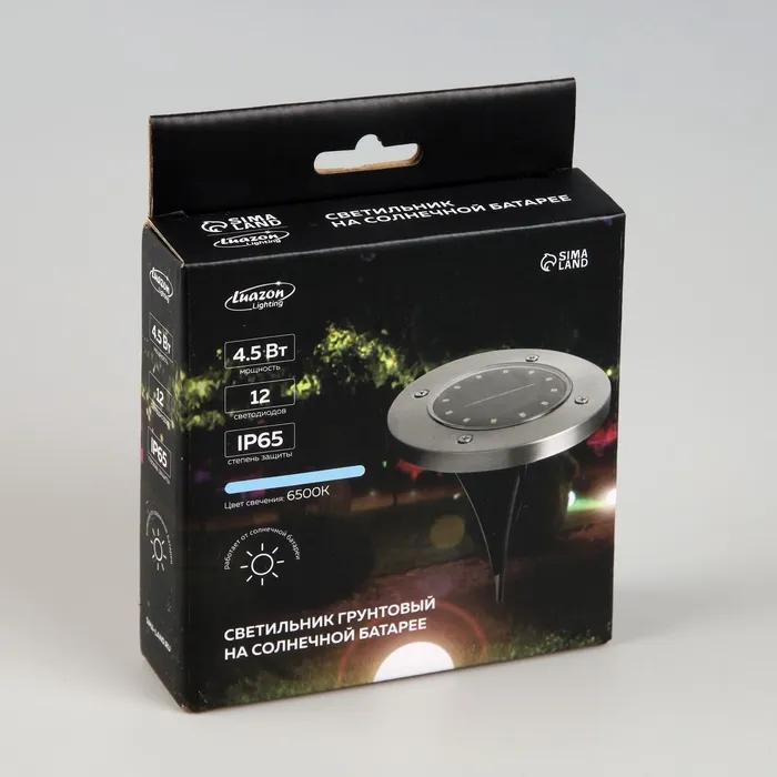 Садовый светильник, уличный, на солнечной батарее, 12 LED, свечение белое — Характеристики