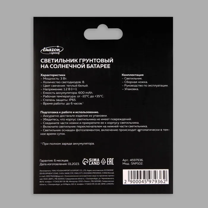 Садовый светильник, уличный, на солнечной батарее, 8 LED, свечение тёплое белое — Характеристики