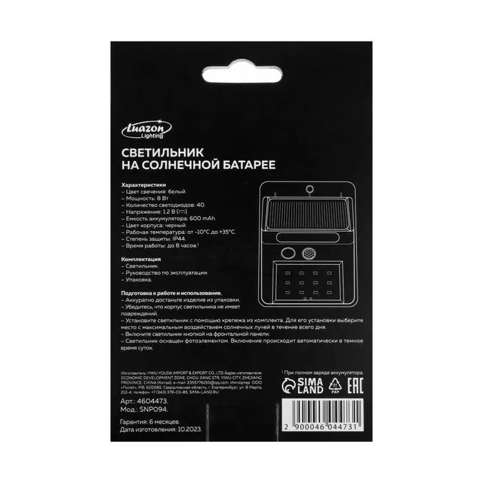 Садовый светильник, уличный, на солнечной батарее с датчиком движения, накладной, 40 LED, свечение белое — Характеристики