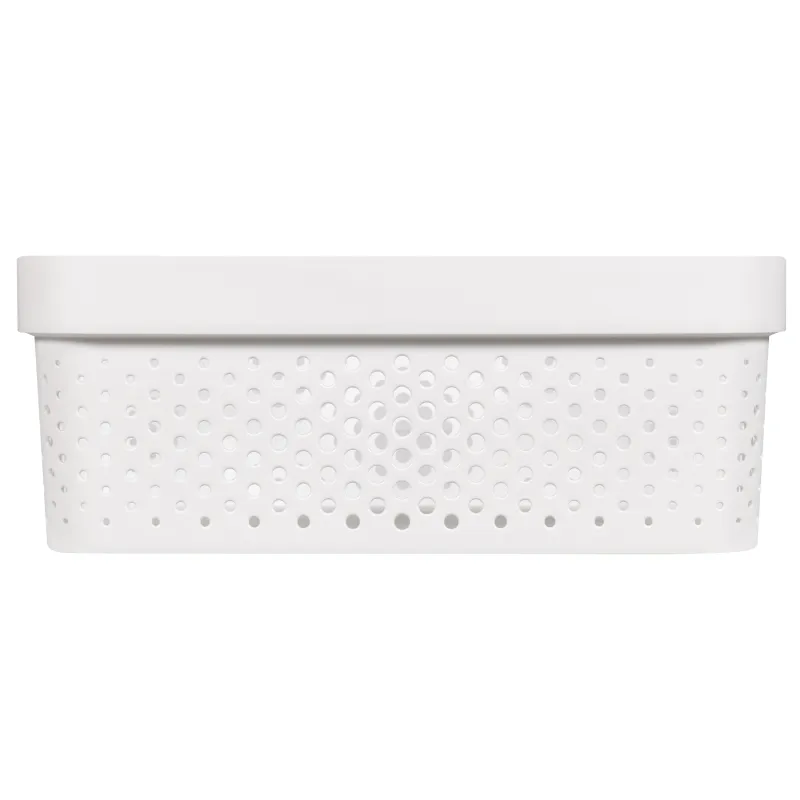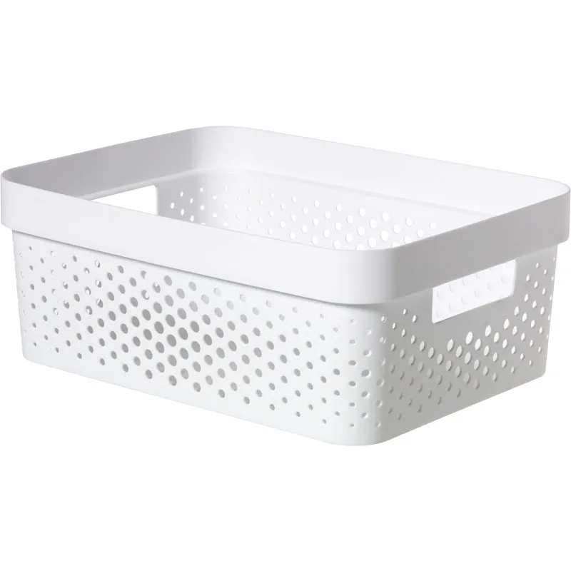 Корзина для хранения Curver Infinity Dots поможет вам держать мелкие предметы в порядке и сохранности. Изготовленная из переработанного пластика, корзина имеет объем 11 литров и размеры 13,6 x 26,6 x 35,6 см. Удобные большие ручки на обоих концах обеспечивают легкость переноски. Доступна в темно-сером или белом цвете с точечным узором.