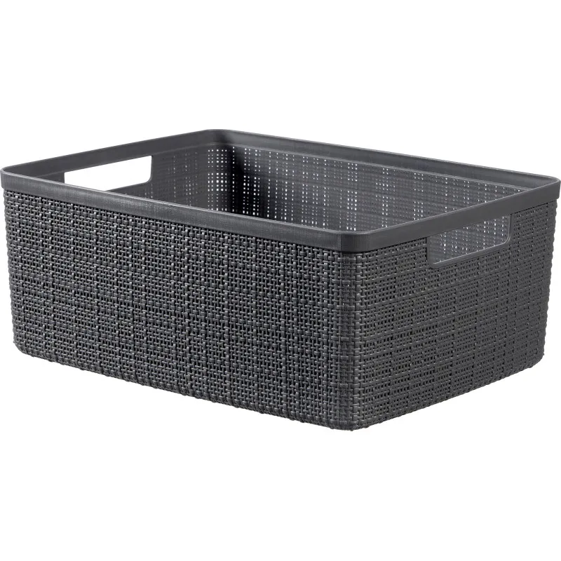 Пластиковая корзина для хранения с поверхностью, напоминающей джутовую ткань. Размеры: 14,5 x 28,2 x 36,2 см. Цвет серый.