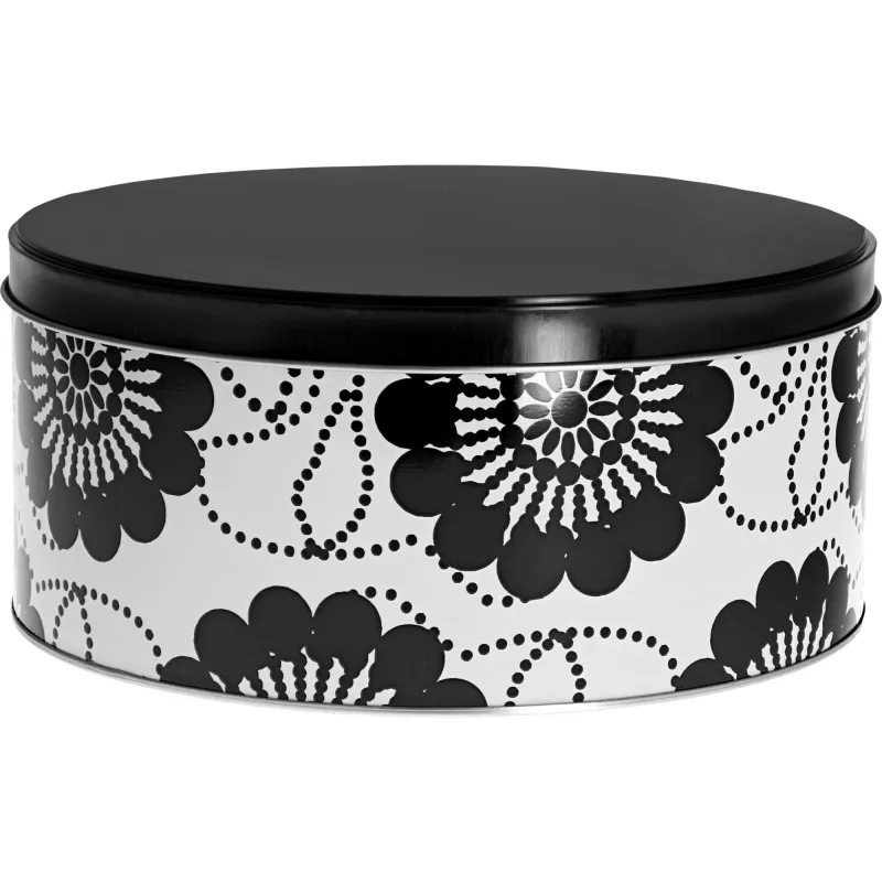 Банка для хранения с крышкой Nordic Tricot by Ivana Helsinki Paulakukka украшена живым цветочным узором и идеально подходит для хранения различных предметов. Металлическая банка размером 19,7 x 19,7 x 8,6 см выполнена в черно-белом цвете.