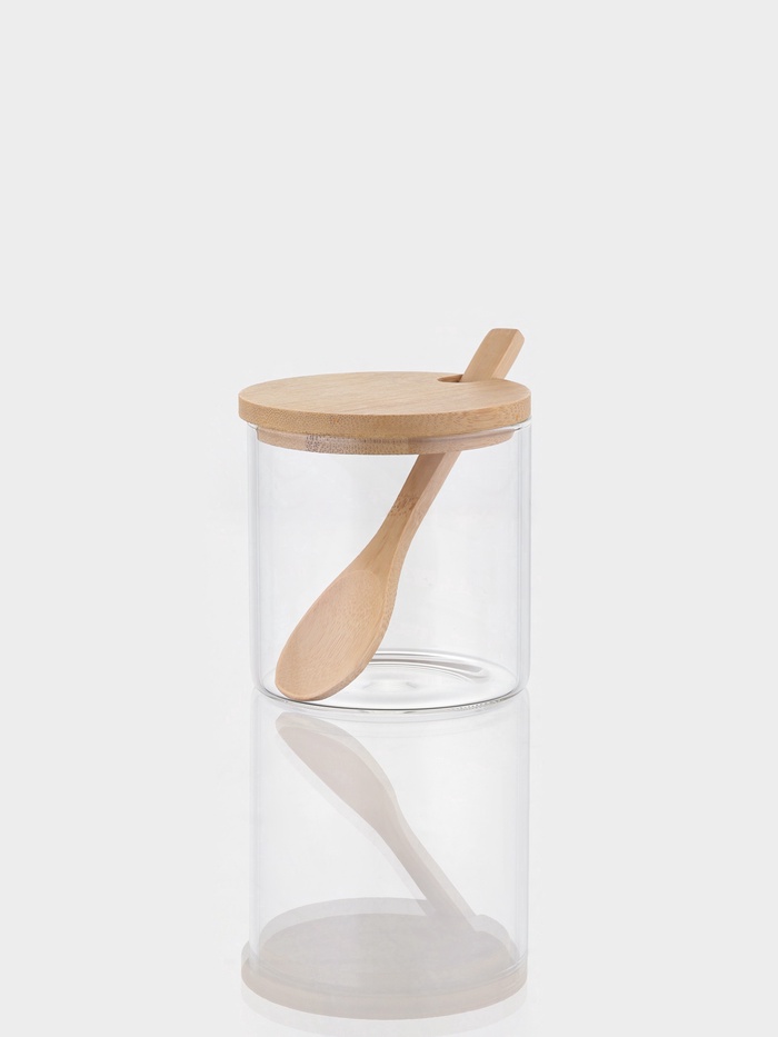 - Надежная защита: Бамбуковая крышка плотно прилегает к стеклянному корпусу. Она оберегает содержимое от влаги и посторонних запахов, сохраняя сыпучесть сахара и его первоначальный вкус.