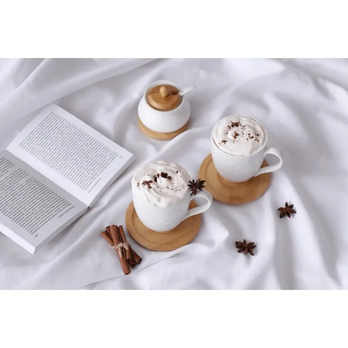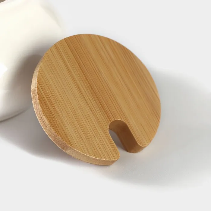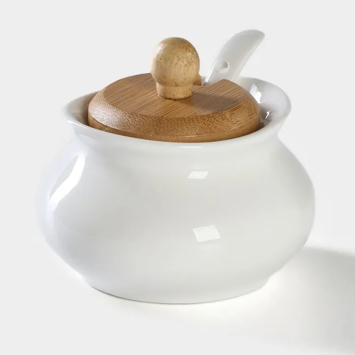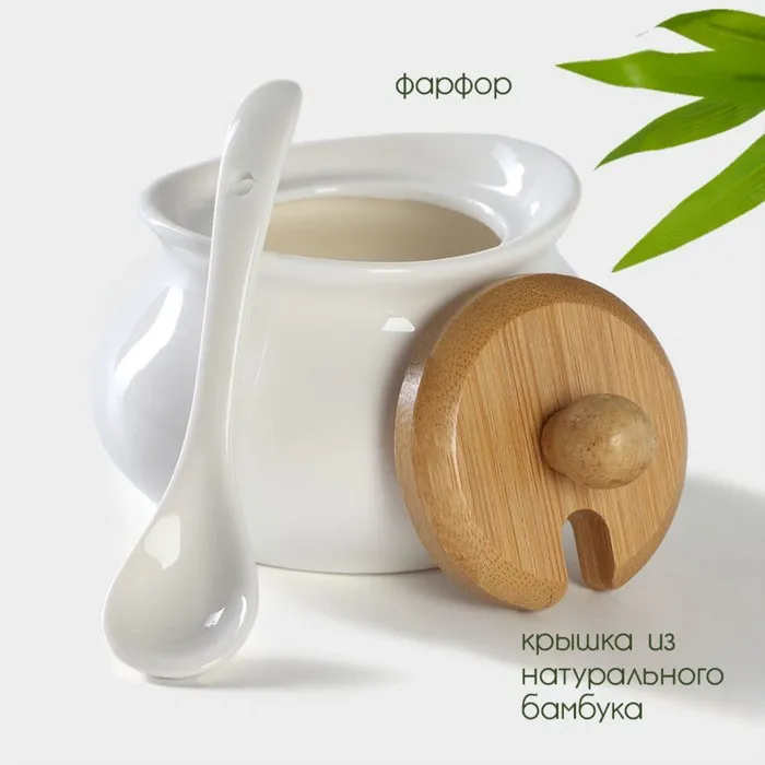 Сахарница BellaTenero, 170 мл, с ложкой, на деревянной подставке, фарфор, белая — Характеристики