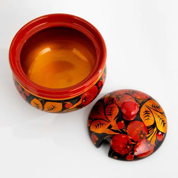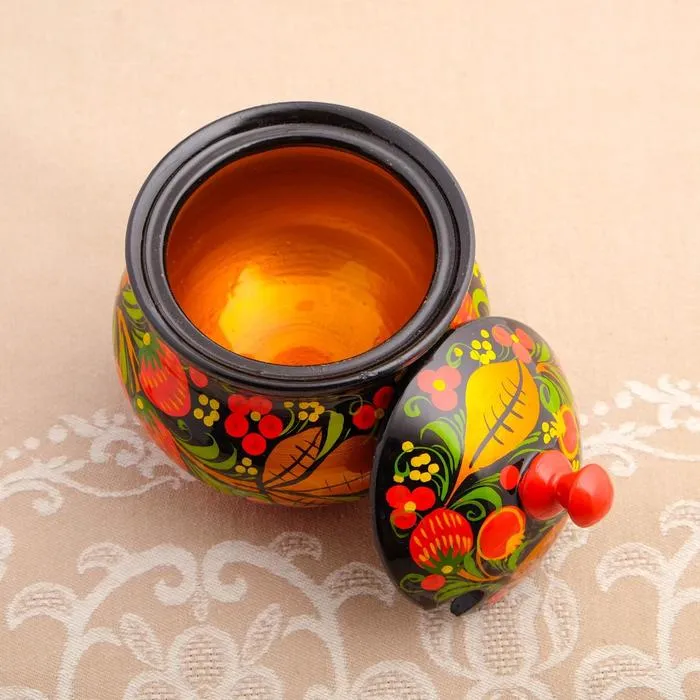 Каждая деталь этой сахарницы пронизана мастерством и любовью к народному искусству. Разноцветный орнамент с изображением спелых ягод на чёрном фоне создаёт атмосферу летнего сада и дарит чувство праздника. Овальная форма и натуральное дерево подчёркивают экологичность и долговечность изделия, а ручная работа придаёт ему особую ценность.