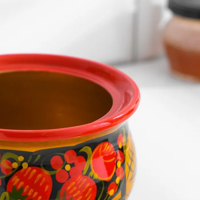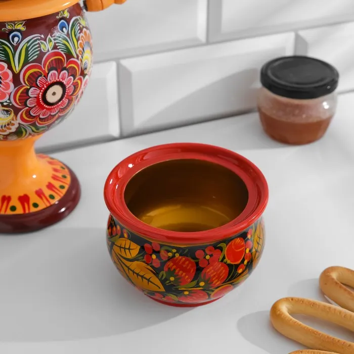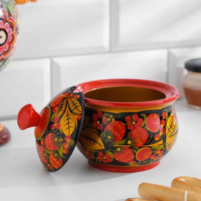 Традиционное русское ремесло оживает в этой миниатюрной хохломской сахарнице, которая станет ярким акцентом на вашем чайном столе. Компактный размер (200 мл) и овальная форма делают её идеальной для хранения сахара на каждый день.