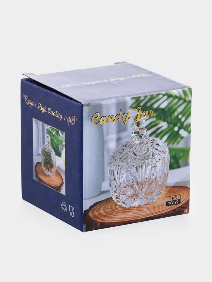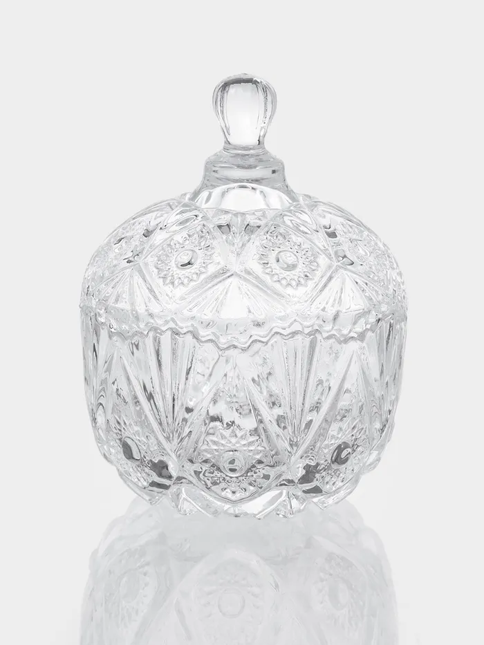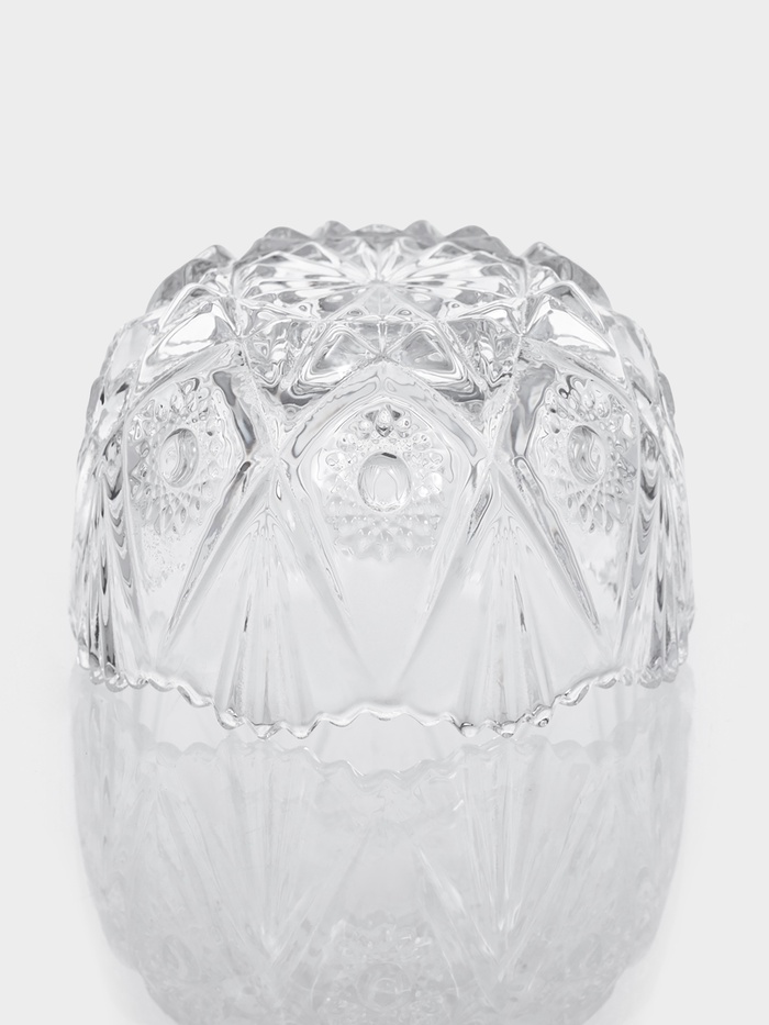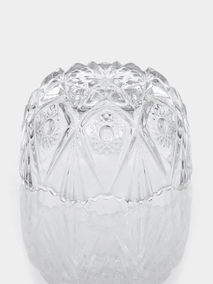 - Лаконичная форма: круглая стеклянная ёмкость с рельефной текстурой удобна в использовании.