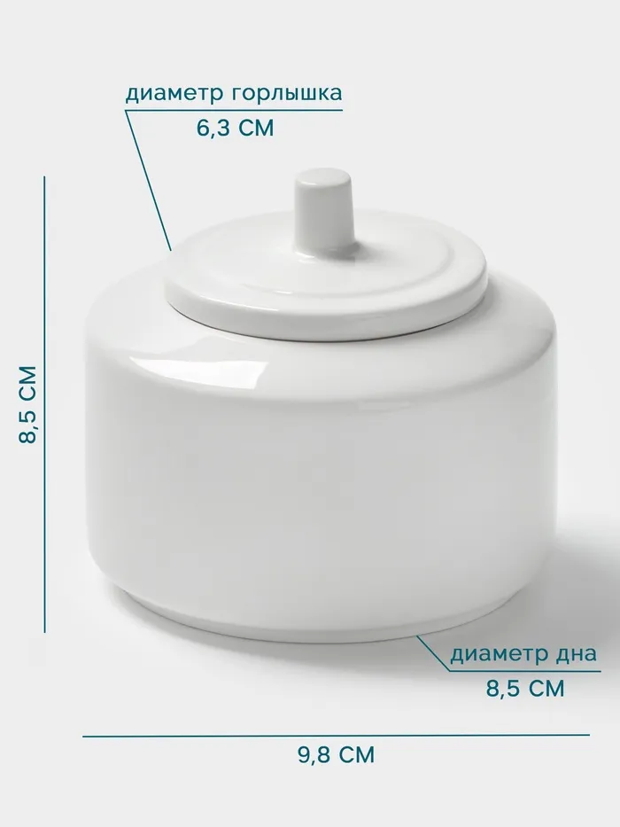 - Круглая форма: компактный размер легко помещается на подносе, тумбе или кухонном столе. Отсутствие ручек и рисунков делает сахарницу универсальной — она вписывается в любой сервиз.