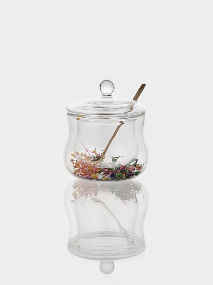 Сахарница с сухоцветами и ложкой — это стеклянный сосуд с двойными стенками, в котором сахар хранится сухим, а подача выглядит аккуратно. Прозрачное стекло и встроенные сухоцветы создают эффект живого букета, не требуя ухода.