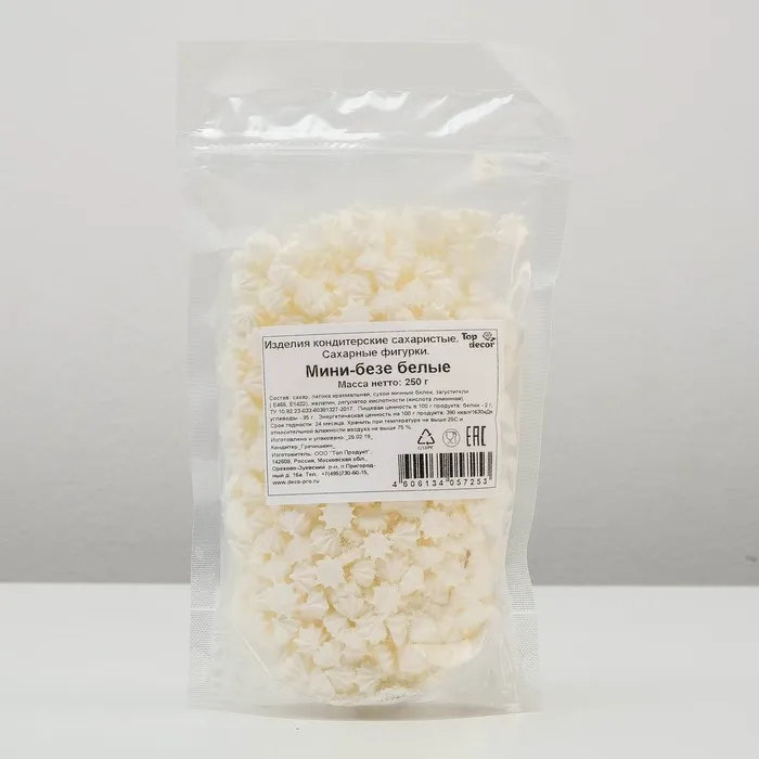 Сахарные фигурки «Мини-безе» в классическом белом цвете — это утонченное и элегантное украшение для ваших десертов, которое добавит воздушности и нежности любому мероприятию! В каждой упаковке весом 250 г вы найдете изящные мини-безе, сделанные из сахара, которые не только выглядят привлекательно, но и порадуют своим сладким вкусом.