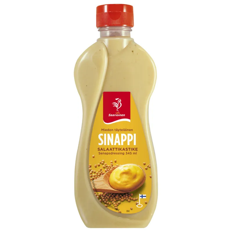 Saarioisten Sinappisalaattikastike — это мягкая и насыщенная горчичная заправка, идеально подходящая для различных салатов. Эта заправка не содержит лактозы и глютена, имеет знак "Сердце" и подходит для веганского рациона. Объем упаковки составляет 345 мл.