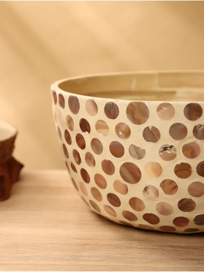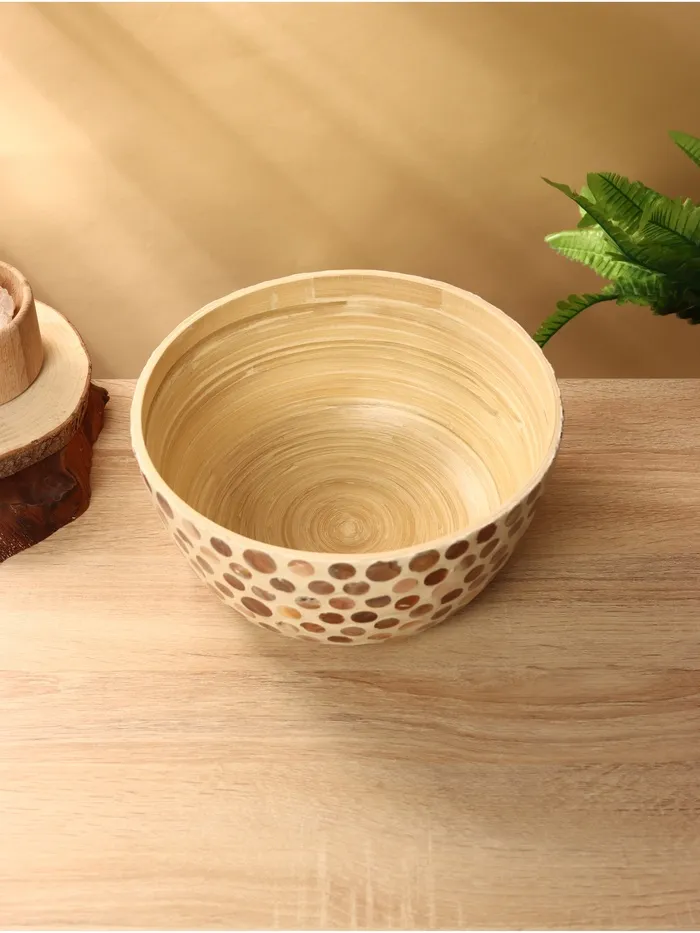 Салатник из бамбука с добавлением раковины станет отличным дополнением вашей кухни. Белый и бежевый цвета с изысканными узорами будут гармонично смотреться на любом столе. Без крышки и в одну тару, этот салатник идеально подходит для сервировки. Диаметр 25,5 см и круглая форма делают его вместительным и удобным. Хотя использовать в СВЧ-печи или в посудомоечной машине не рекомендуется, он безопасен для горячих блюд. Гладкая текстура и ручная работа подчеркивают его утончённость и качество.