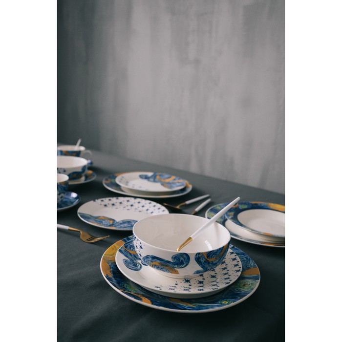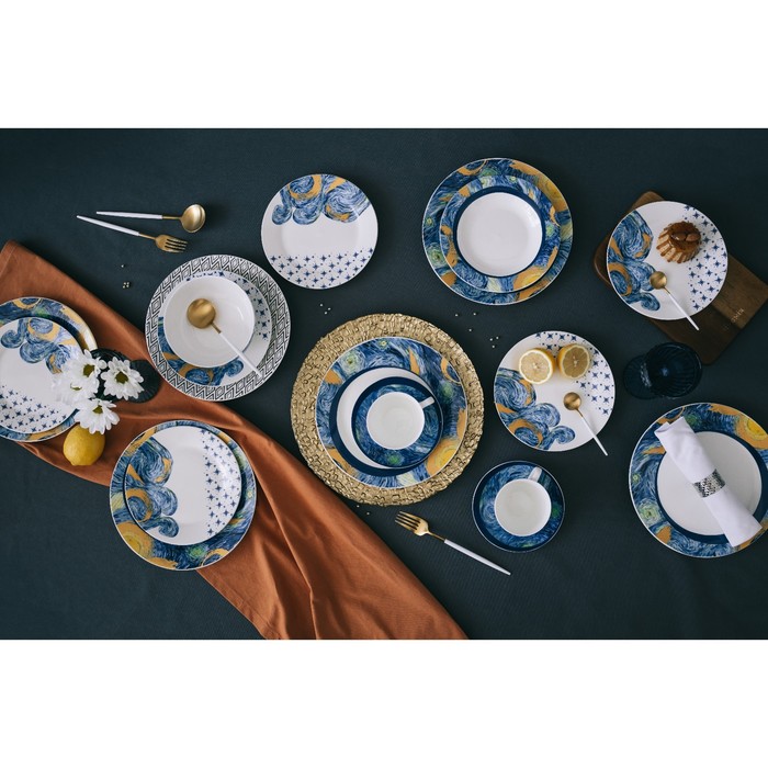 Серия посуды «Звездная ночь» вдохновлена полотнами Винсента Ван Гога. Она выполнена из фарфора с изображением предрассветного неба. Невероятно приятная, контрастная цветовая комбинация шедевра воодушевляет и завораживает. Такая посуда станет украшением обеденного стола, а также замечательным подарком.