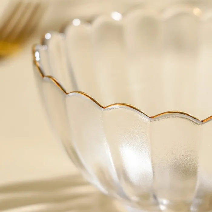 Этот прозрачный салатник с декоративным рельефом и золотым акцентом отлично впишется в интерьер любой кухни, подчёркивая аккуратность и вкус.