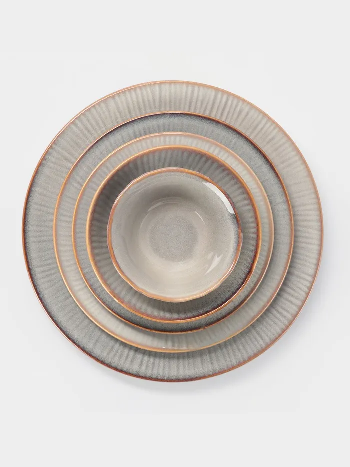 Изготовленный из высококачественного фарфора, он обладает гладкой текстурой и приятным серым цветом, что делает его универсальным для любого интерьера. Круглая форма и отсутствие рисунка подчеркивают минималистичный дизайн.