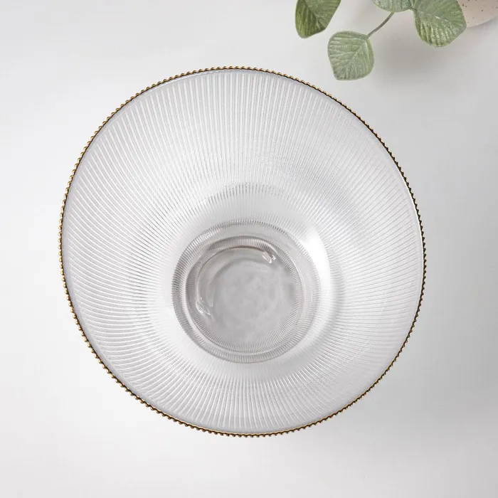Салатник «Орион» изготовлен из качественного и прочного стекла, имеет необычную форму и красивый рельеф и отводку золотом по краю. Такой салатник подойдёт для классической сервировки и фуршета.