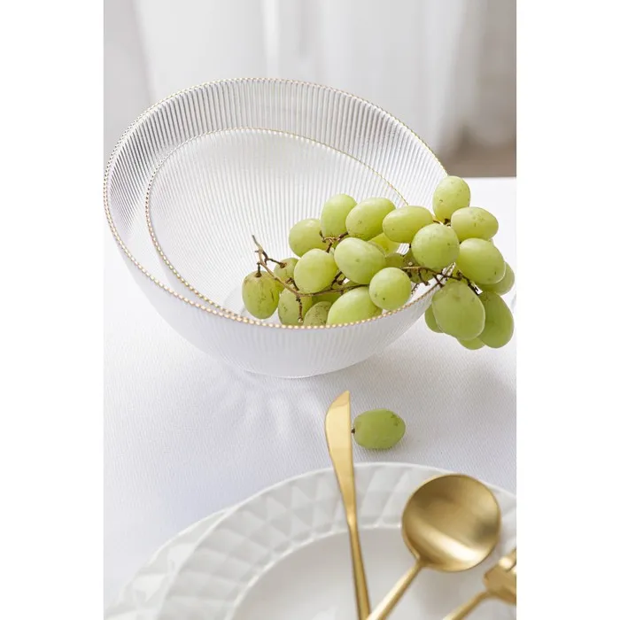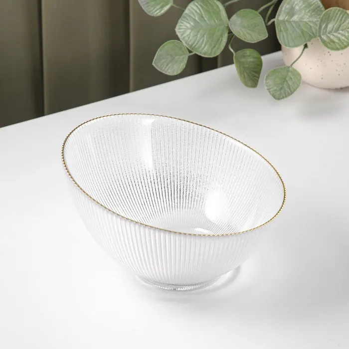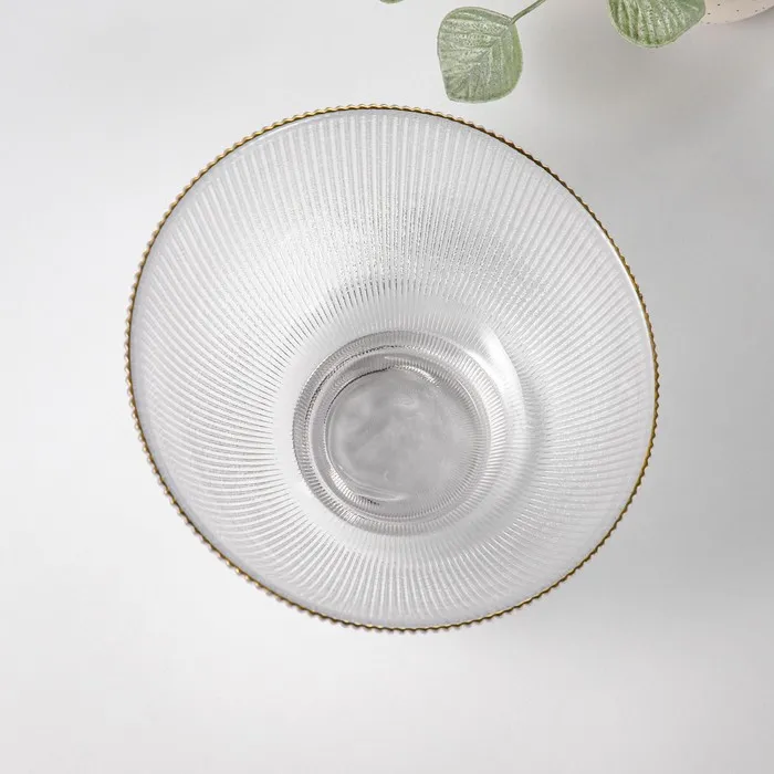 Салатник «Орион» изготовлен из качественного и прочного стекла, имеет необычную форму и красивый рельеф и отводку золотом по краю. Такой салатник подойдёт для классической сервировки и фуршета.