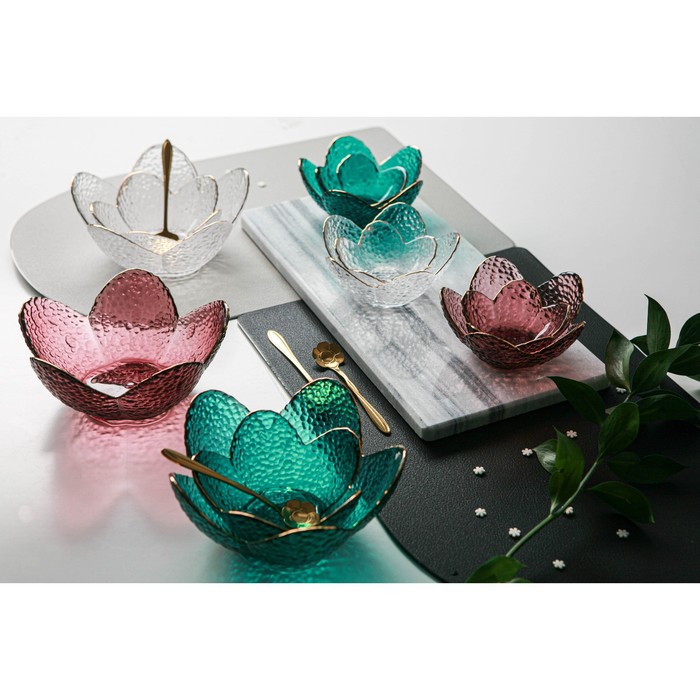 Посуда из стекла серии «Цветочный сад» имеет красивый рельеф и золотую отводку по краю. Изделия в форме распустившихся бутонов выполнены в изумрудном, голубом, розовом оттенках. Глубокие тарелочки разного объёма предназначены для салатов, закусок, десертов, густых соусов. Ёмкости сделают подачу интересной, они обязательно запомнятся вашим гостям!