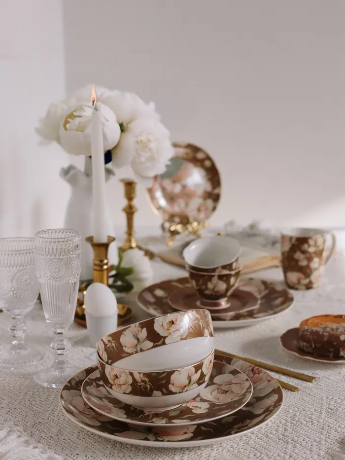 - Цветочно-растительный декор "Pink O'hara": нежный и утонченный рисунок добавляет нотку романтики и весеннего настроения в вашу сервировку.