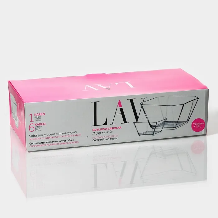 Набор из семи квадратных стеклянных салатников разного объёма объединяет удобство и универсальность для кухни. Шесть небольших мисок объёмом 300 мл идеально подходят для порционных блюд, а большая миска на 1,9 л — для сервировки основных салатов и закусок.