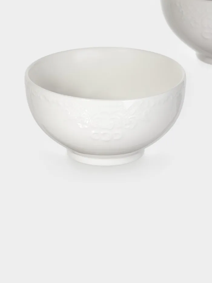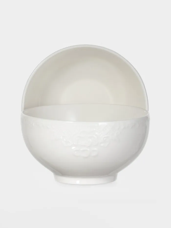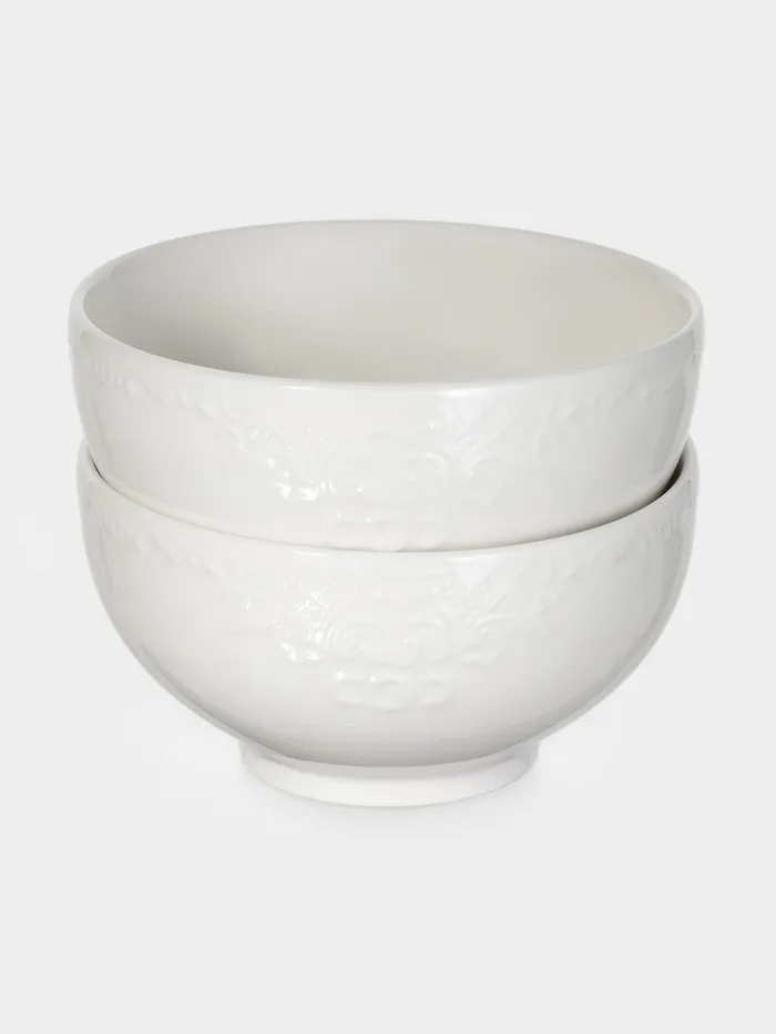 Представляем вам набор из двух белых фарфоровых салатников объемом 580 мл каждый. Салатники выполнены из нового костяного фарфора с рельефной текстурой и барельефом, придающим им особый шарм. Подходят для подачи салатов, закусок и других блюд. Можно использовать в микроволновой печи и мыть в посудомоечной машине.