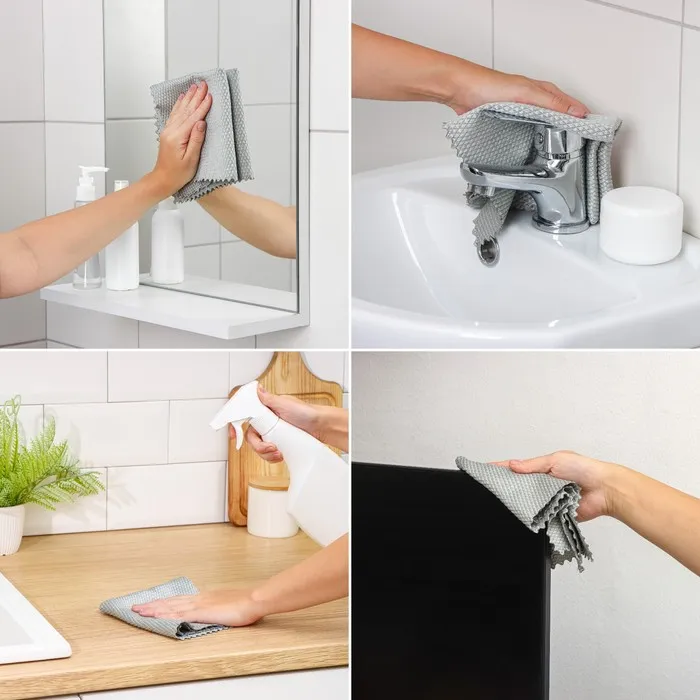 Салфетка имеет гладкую фактуру, которая позволяет очистить поверхность, не прикладывая особых усилий. Её также можно использовать для бокалов, фужеров, люстр, автомобильных стёкол и других предметов, требующих ухода.