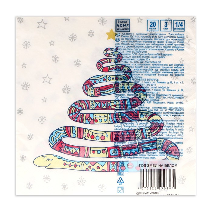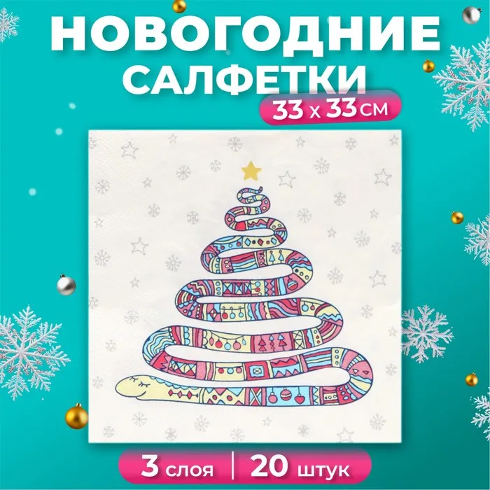 Салфетки бумажные новогодние «Год змеи на белом», 3 слоя, 33х33 см, 20 шт — Характеристики