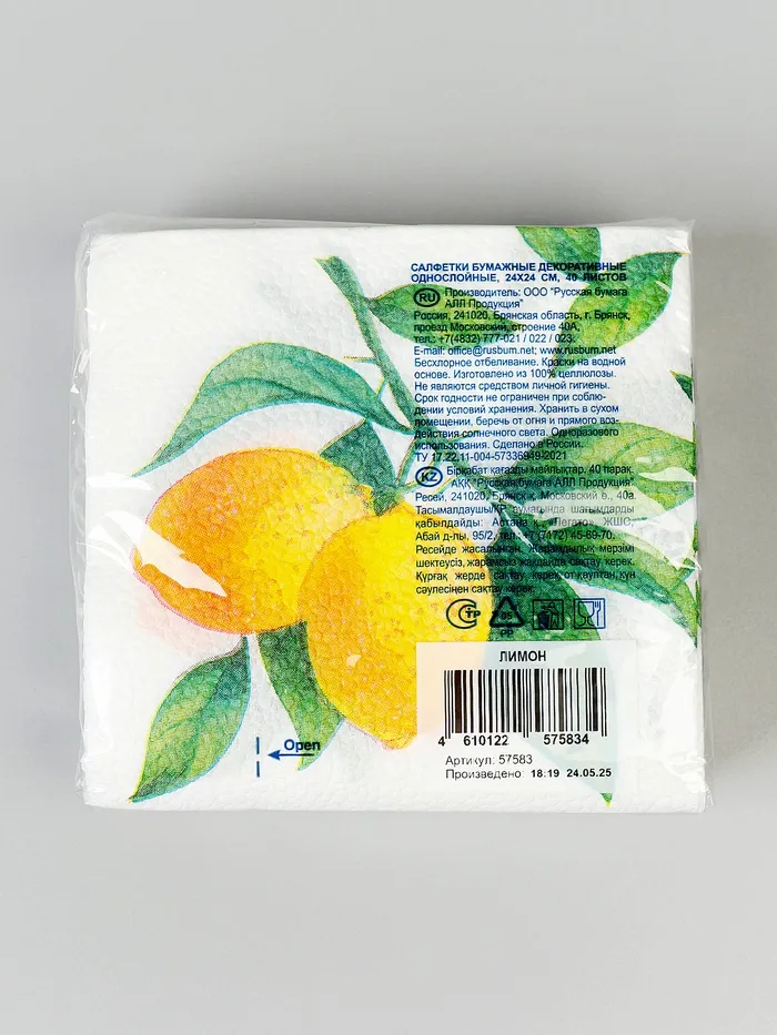 Салфетки бумажные однослойные «Лимон», 24х24, 40 шт — Характеристики