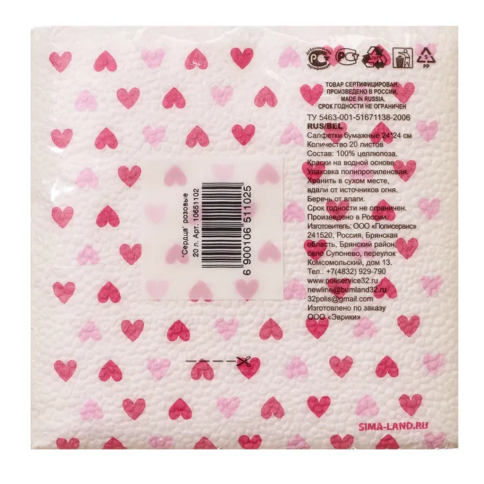 Салфетки бумажные однослойные «Сердца», 24 х 24 см, 20 шт — Характеристики