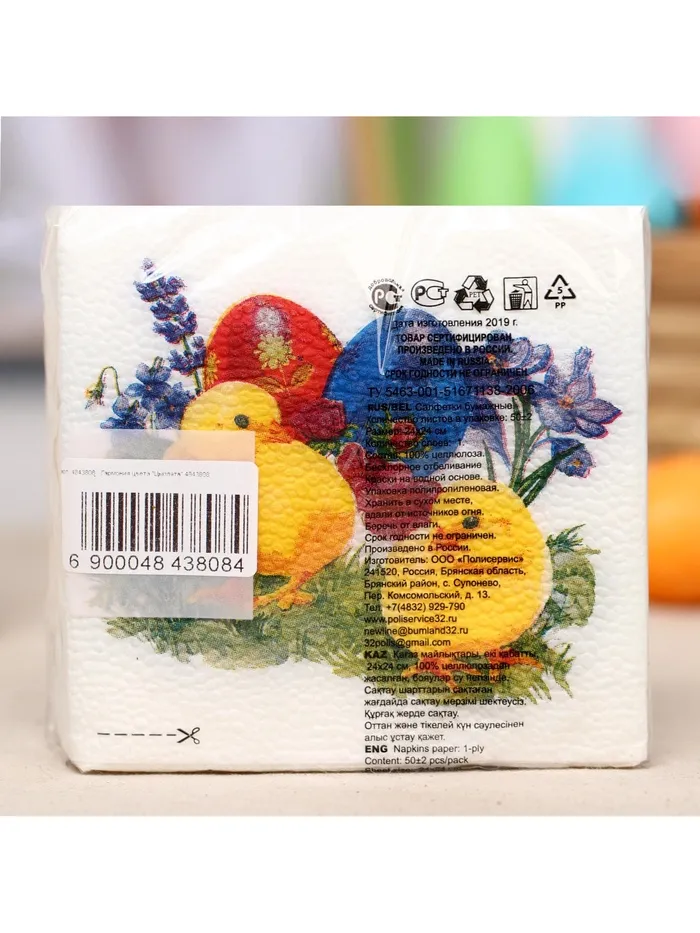 Пасхальные сервировочные бумажные салфетки Гармония цвета с рисунком «Цыплята» - это отличное украшение для вашего праздничного стола. Идеально подойдут как для сервировки, так и в качестве декора и украшения в домашних условиях или на больших мероприятиях. Праздничные салфетки с пасхальным рисунком будут хорошим подарком для родных и близких. Данные салфетки можно использовать так же для декупажа и коллажей.