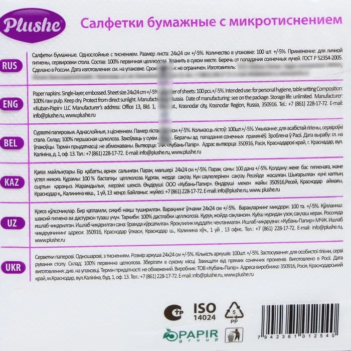 Однослойные бумажные салфетки Plushe Standart изготовлены из 100% первичной целлюлозы. Благодаря особому виду тиснения салфетки отлично держат форму и обладают дополнительными впитывающими свойствами. Бумажные салфетки прекрасно подойдут для использования во время еды и станут незаменимым атрибутом на вашей кухне.