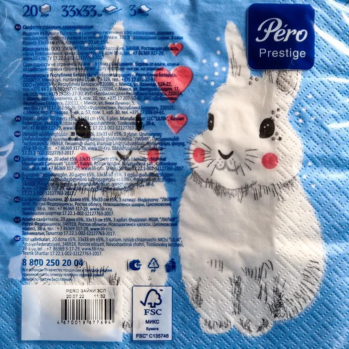 Качественные трехслойные бумажные салфетки изготовлены из качественной целлюлозы. На салфетках нанесен яркий рисунок.
