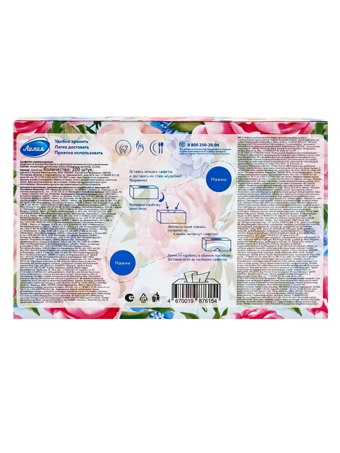Салфетки бумажные в коробке станут Вашим помощником в личной гигиене и уборке! Салфетки используются также и для косметических целей! Подходят детям и взрослым для частого использования в быту, во время еды, для умывания и при насморке. Мягкие двухслойные и достаточно плотные, бумажные салфетки-платочки, подарят ощущение комфорта и чистоты, хорошо впитывают излишки влаги! Коробка имеет удобную конструкцию, которая позволяет быстро и легко извлечь салфетки, даже когда они заканчиваются. Они очень удобно извлекаются, для этого нужно сверху коробки надавить на синий овал с названием салфеток и в образовавшемся отверстии появится часть салфетки. Далее мы достаем первую салфетку и за ней начнет появляться вторая. После этого легко сдергиваем салфетку в верх или сторону и она свободно отделяется от второй салфетки, а вторая салфетка будет немножко выглядывать из картона. Когда салфетки начинают заканчиваться, необходимо перевернуть коробку вверх-дном, нажать на специальное место, которое находится посредине коробки и нижние салфетки начнут с легкостью вытягивается. Информация с инструкцией размещена на обратной стороне коробки.