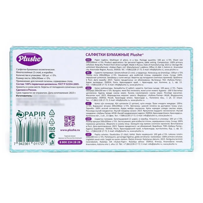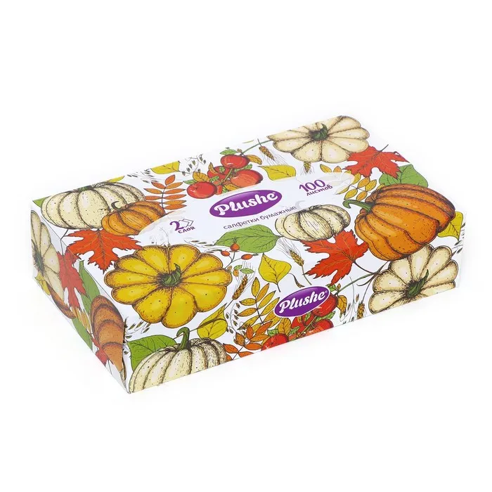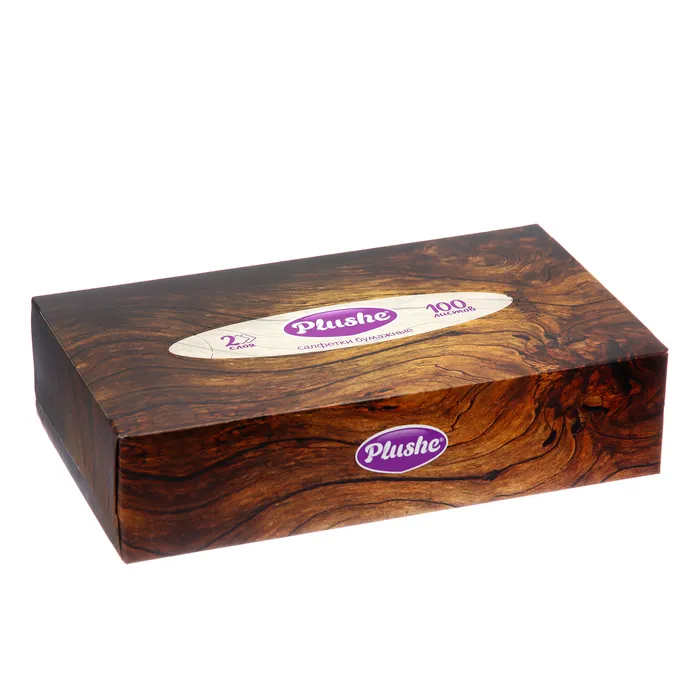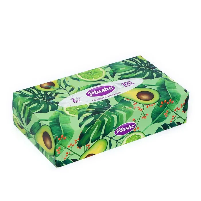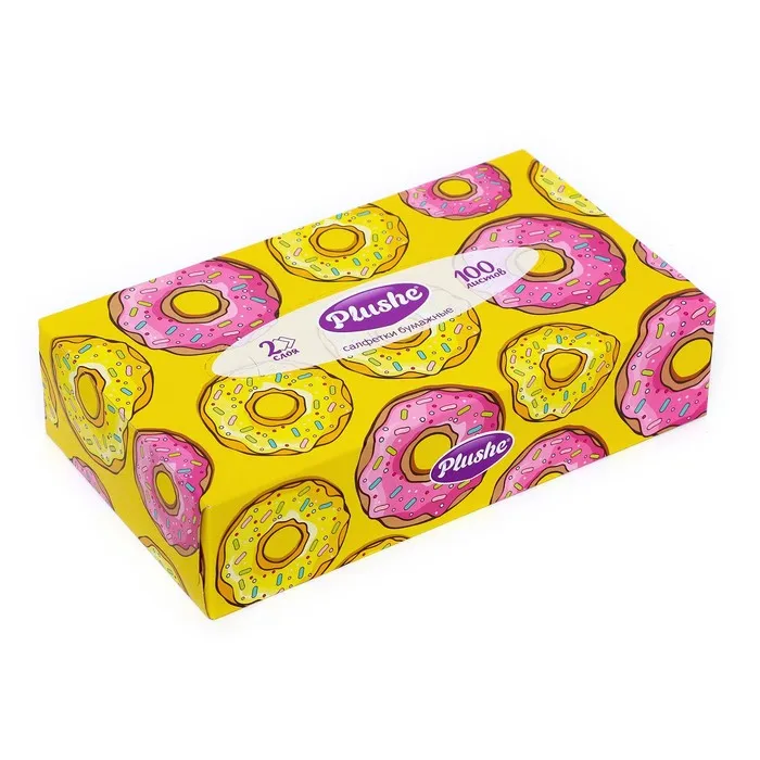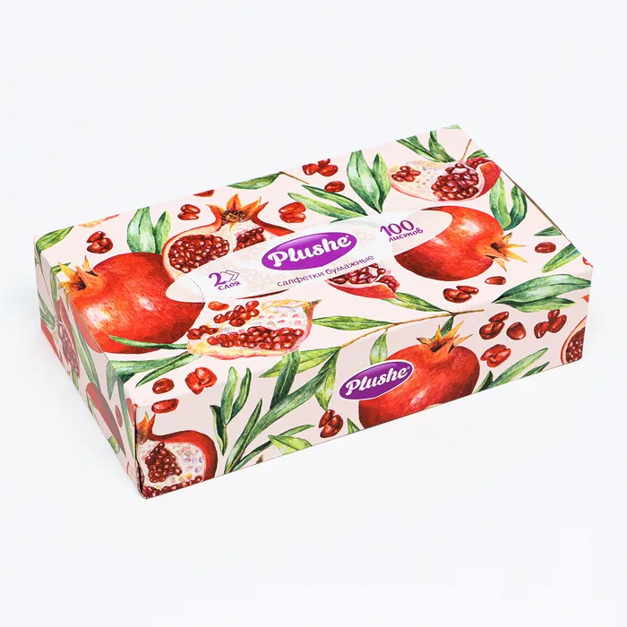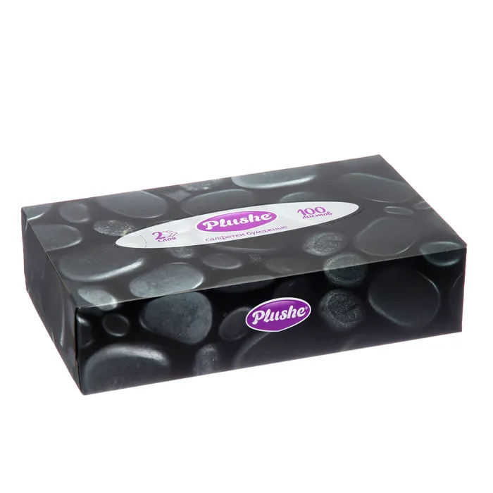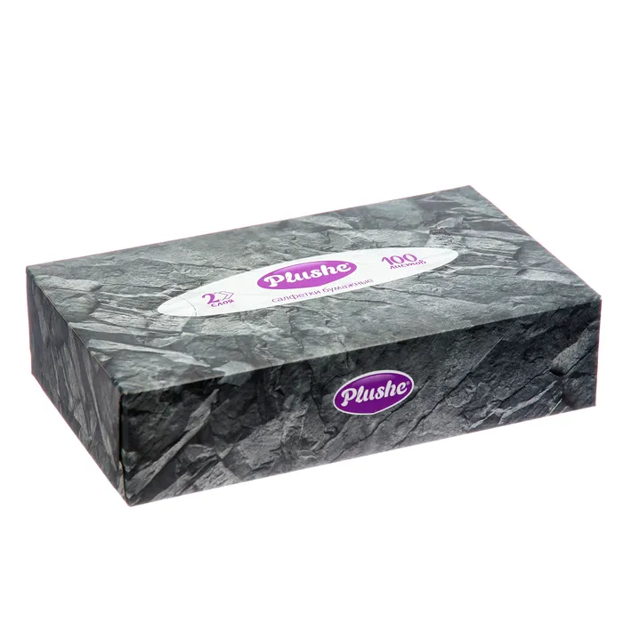Бумажные салфетки формата нон-стоп надежно хранятся в коробочках по 100 штук и легко достаются даже одной рукой. Салфетки Plushe изготовлены из 100% первичной целлюлозы, что делает их мягкими и воздушными, поэтому вы без сомнения можете доверить им заботу о нежной коже рук и лица. Дизайн упаковки может отличаться в зависимости от партии товара.