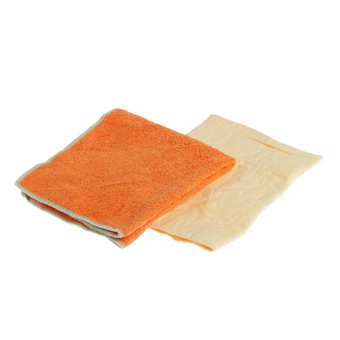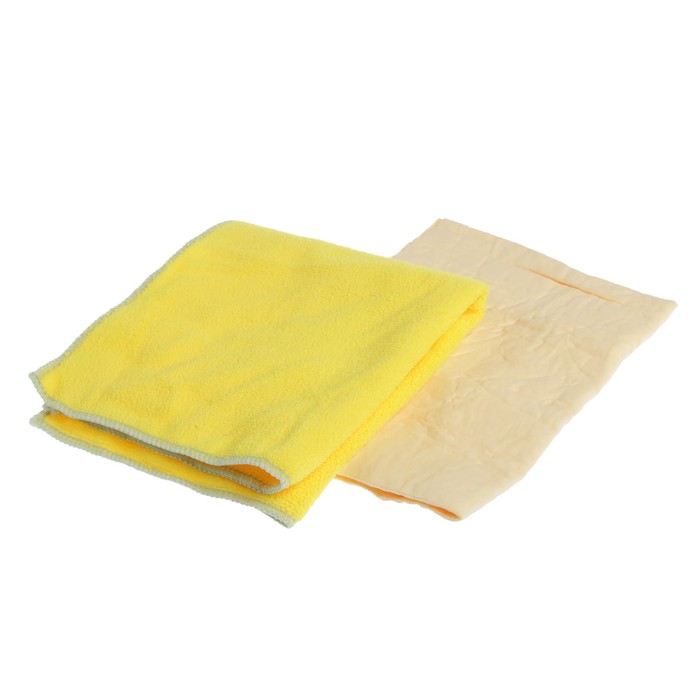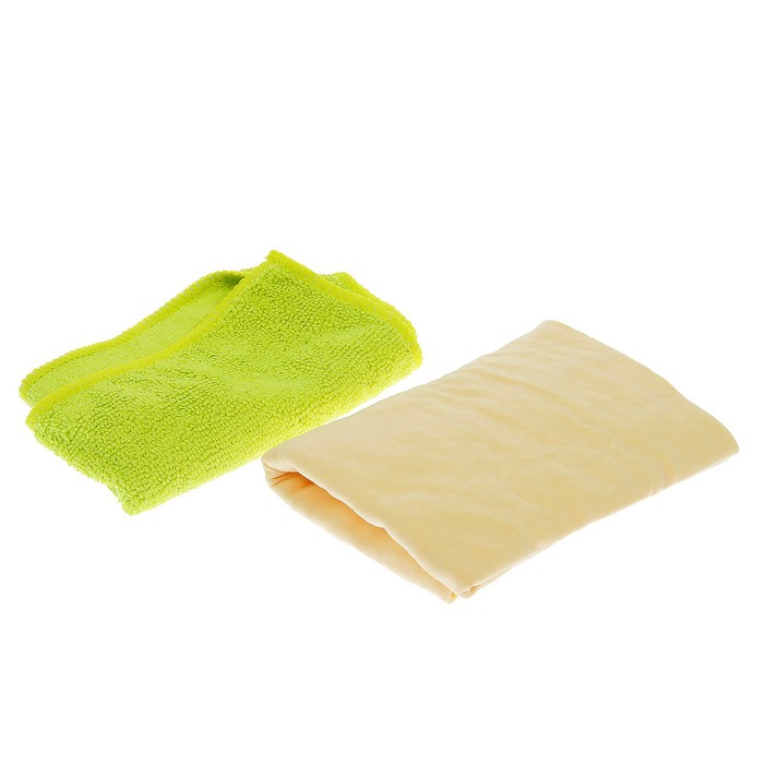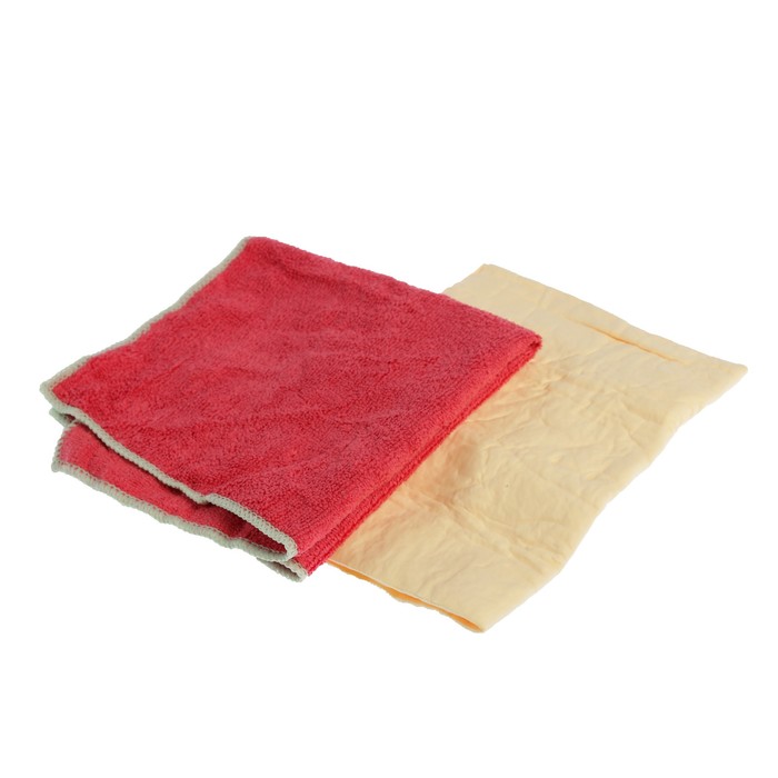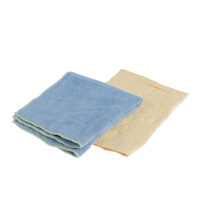 Синтетическая замша + микрофибра. Набор из двух салфеток для качественного ухода за автомобилем, домом, офисом. Влажная замшевая салфетка - для протирки стекол и зеркал и придания им кристальной прозрачности. Микрофибра - для мойки, чистки и сушки интерьера автомобиля.