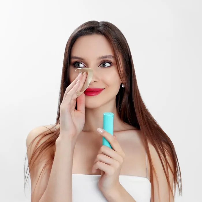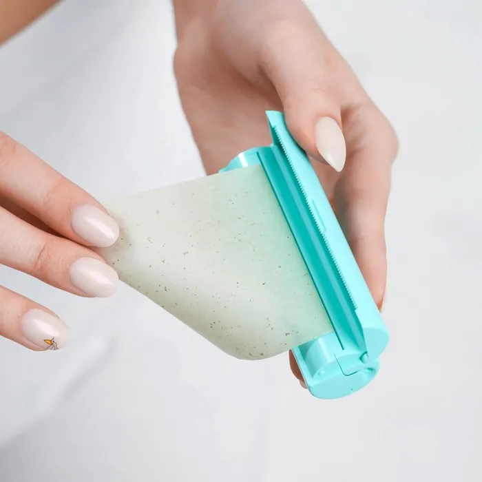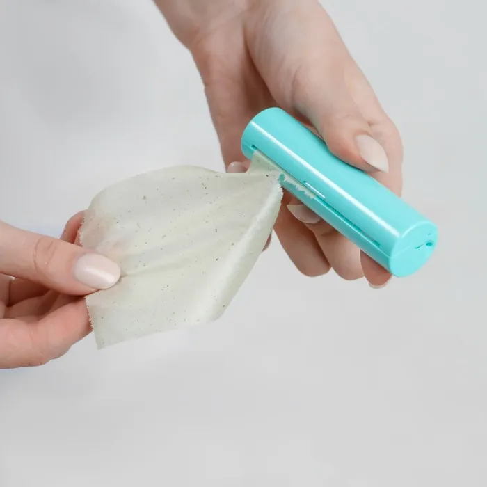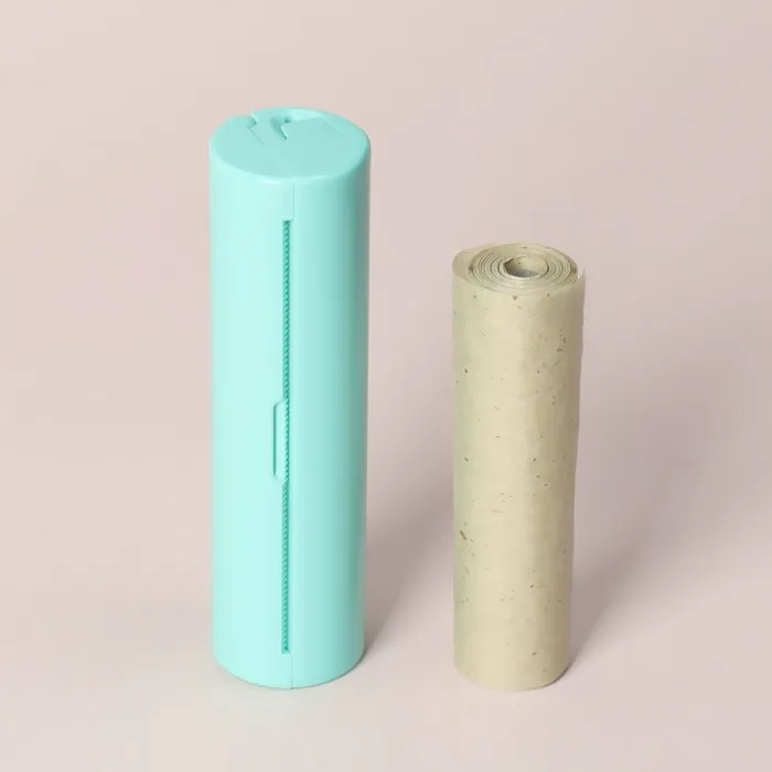 Матирующие салфетки в рулоне поставляется в твердом пластиковом футляре, внутри –7 м. Размера футляра – d 2,4 × 9 см.