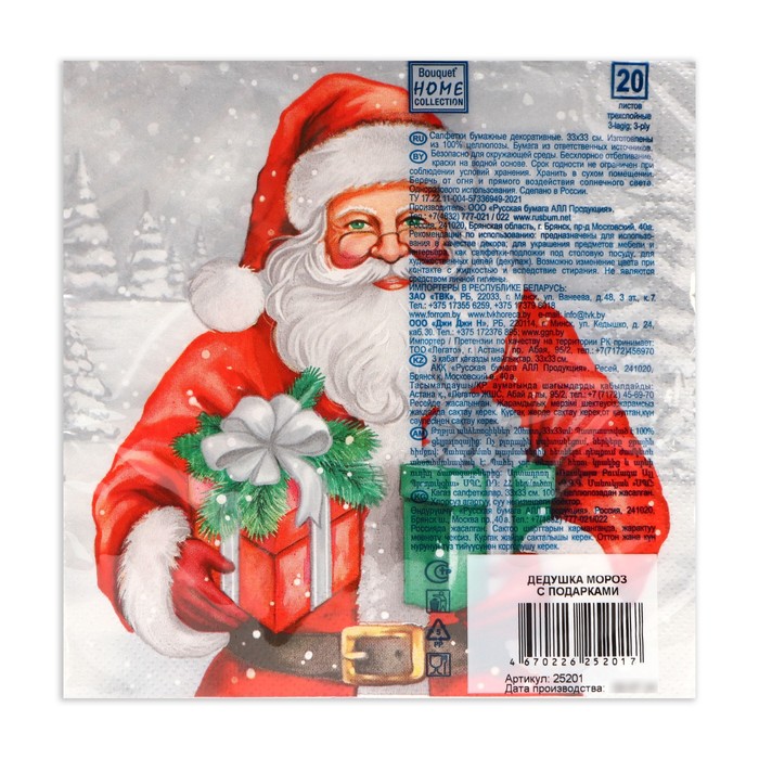 Салфетки новогодние бумажные Home Collection «Дедушка Мороз с подарками», 3 слоя, 33×33 см, 20 шт. — Характеристики