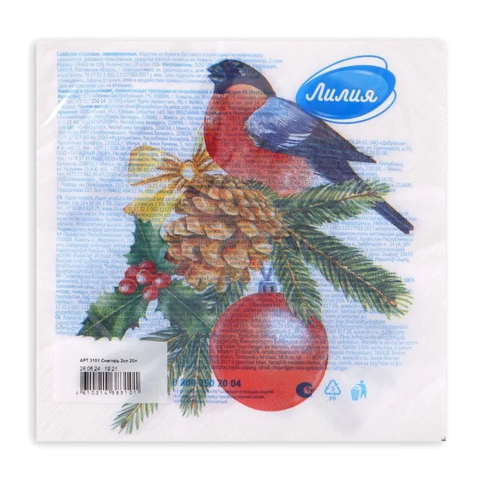 Салфетки новогодние бумажные Лилия «Снегирь», 2 слоя, 33х33 см, 20 шт — Характеристики