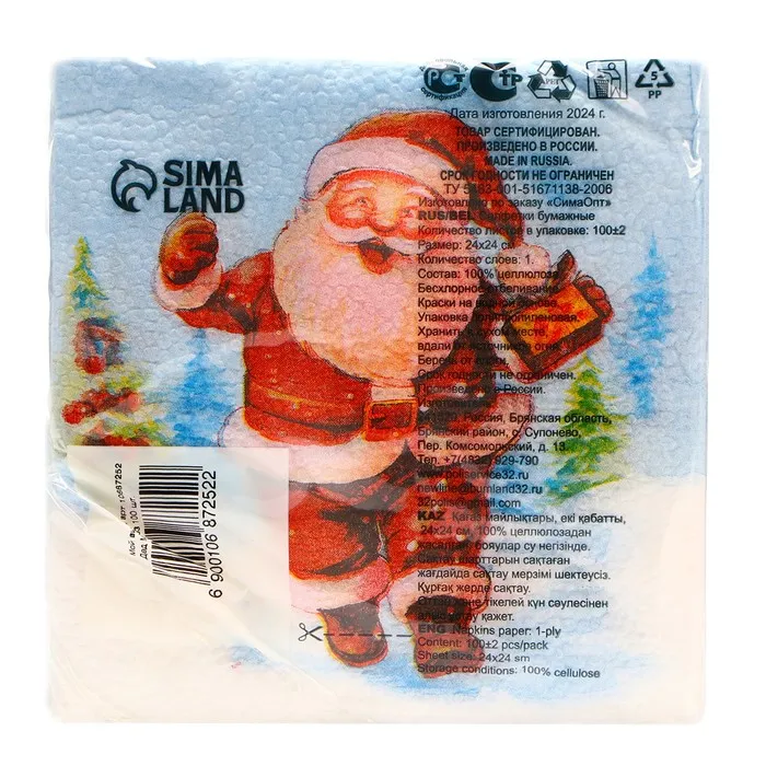 Состав 100% целлюлоза. Размер салфетки в развёрнутом виде 24х24 см. в сложенном виде 12х12 см.