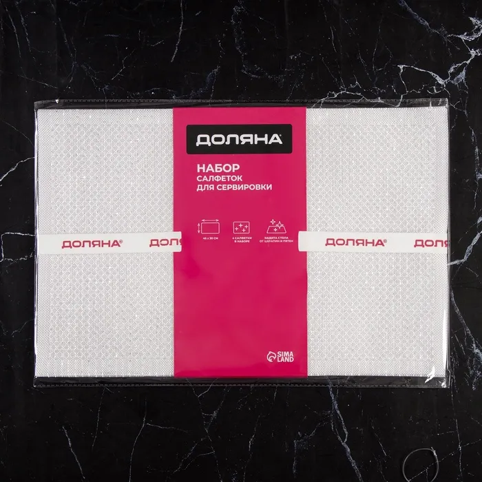 Набор состоит из четырёх салфеток, выполненных из качественного ПВХ и полиэстера. Удобный прямоугольный формат идеально подойдет для вашей столовой, будь то семейный ужин или праздничное застолье. Кроме того, их блестящий дизайн будет превосходно сочетаться с любым столовым сервизом!