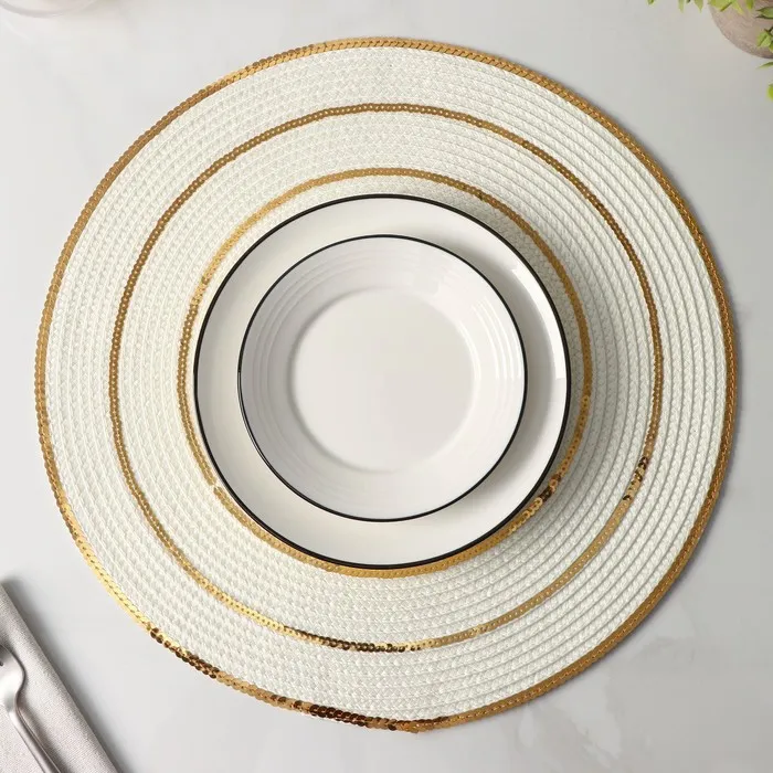 Придайте вашему столу неповторимый стиль и изящество с набором сервировочных салфеток от Доляна. Эти элегантные белые салфетки диаметром 38 см с золотым акцентом – это идеальное сочетание стиля и функциональности, которое украсит любую трапезу, будь то обычный ужин или праздничный банкет.