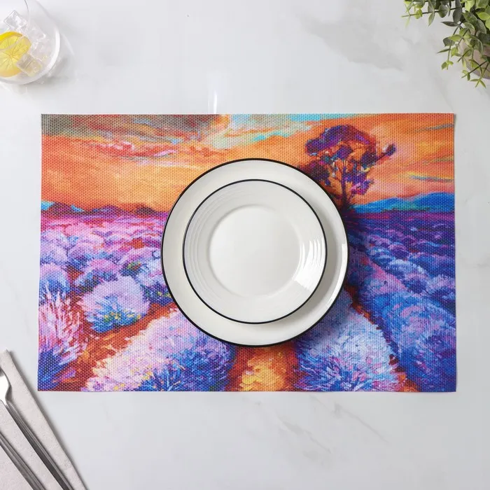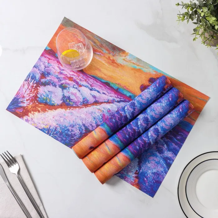 Набор включает четыре салфетки в насыщенных оранжевых, фиолетовых и разноцветных тонах, рисующие живописные пейзажи. Это делает их не только функциональными, но и настоящим произведением искусства, которое сможет оживить вашу трапезу, притягивая взгляды гостей. Изготовленные из высококачественного ПВХ, эти салфетки легко очищаются, делая процесс обслуживания за столом проще и комфортнее.