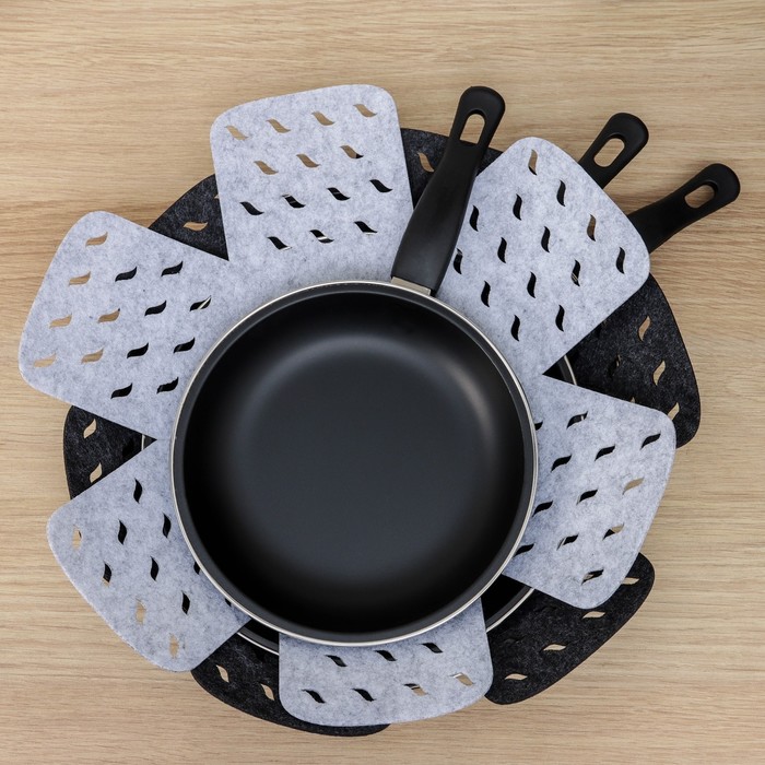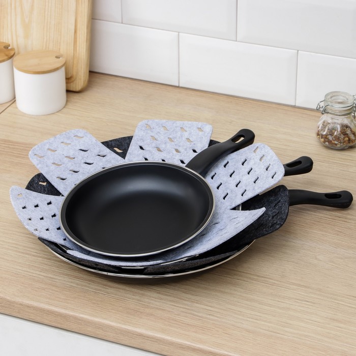 Разделители для посуды изготовлены из фетра, поэтому идеально подойдут для хранения кастрюль, сковородок, стеклянной и керамической посуды. Использование вкладышей продлевает срок службы посуды, сохраняя её первоначальный внешний вид. Также подойдут для бережной транспортировки. Положив салфетку между предметами, сможете защитить их поверхность от повреждений, царапин и сколов.