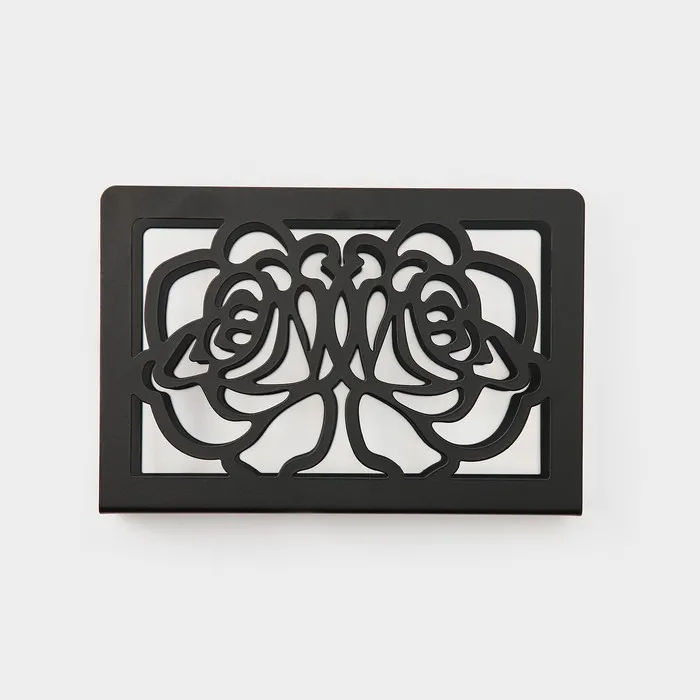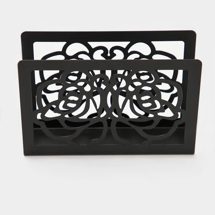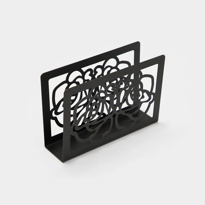 Изготовленная из качественного металла, эта черная салфетница с цветочным дизайном привлекает взгляды и добавляет нотку романтики в ваш дом. Прямоугольная форма позволяет удобно размещать салфетки, а тематика цветочно-растительная прекрасно подходит для любого события — от обычного ужина до празднования Международного женского дня.
