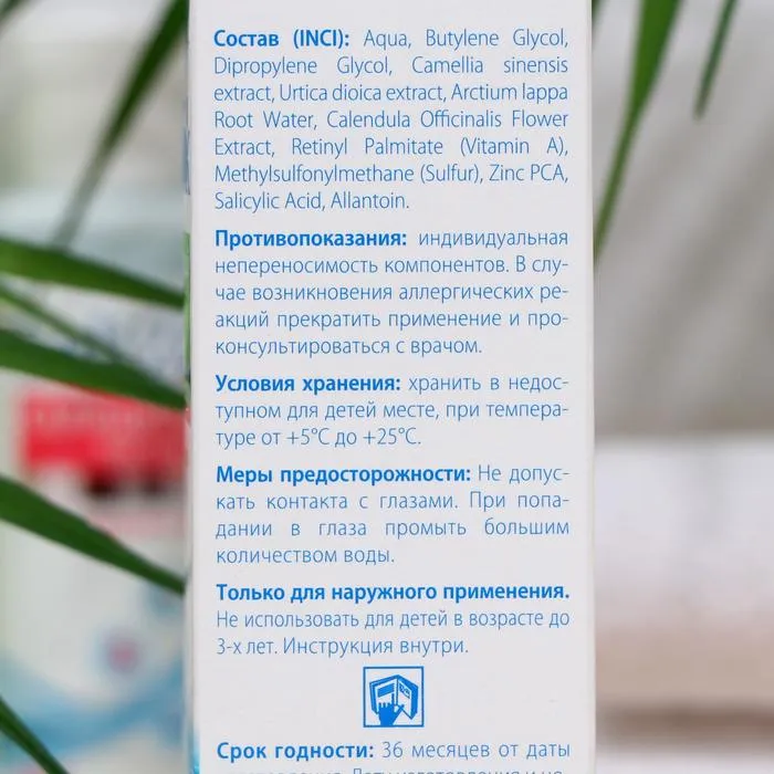 Лосьон от прыщей не содержит спирт, сульфаты, парабены. pH близок к pH кожи: от 5,6 до 6,1.