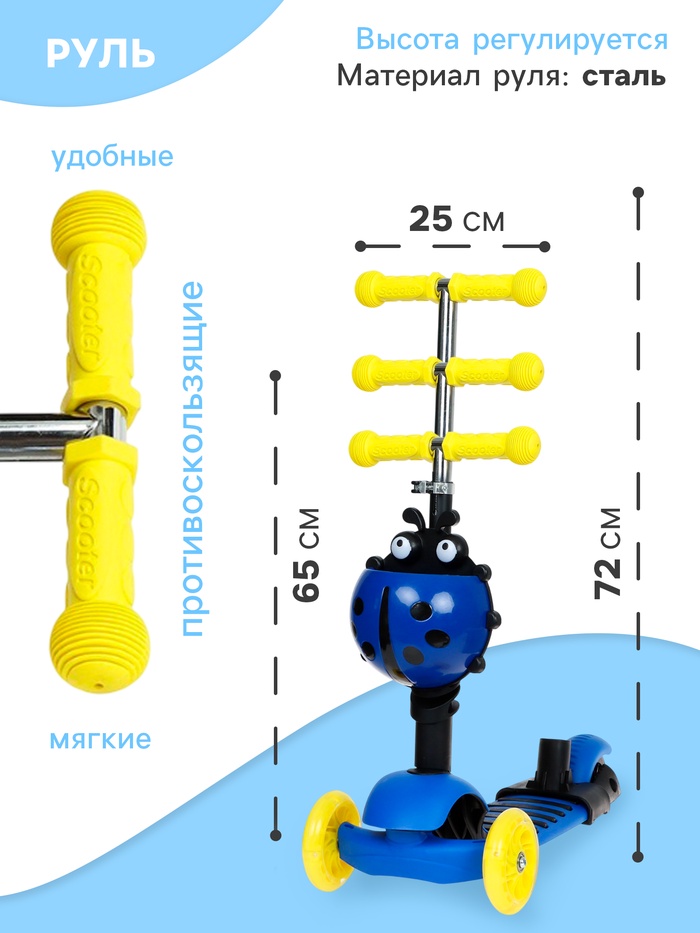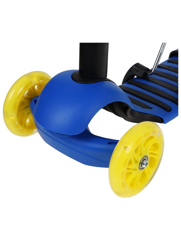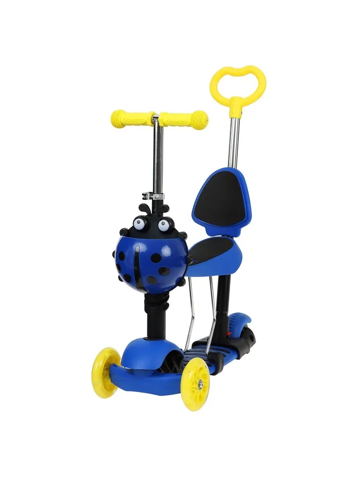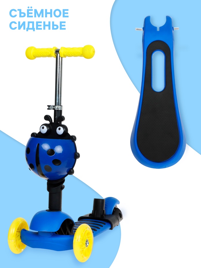 При установленном сиденье – это беговел, благодаря такой функции ребёнок развивает навыки координации и укрепляет мышцы ног. Если сиденье снято – это полноценный самокат, который позволяет прорабатывать мышцы верхних, нижних конечностей, мышц спины и брюшной полости.